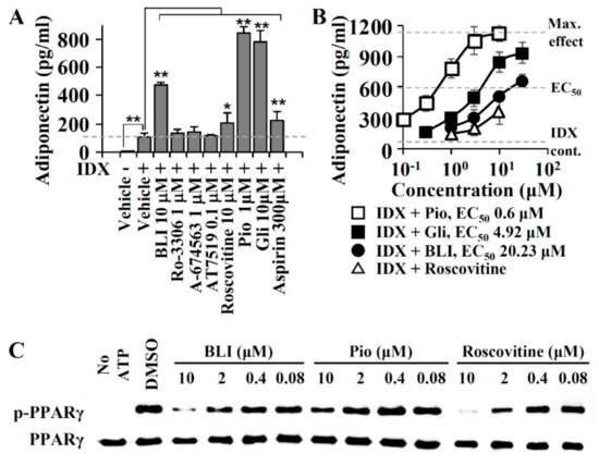 Effects of cyclin-dependent kinase (CDK5) inhibitors on adiponectin production during hBM-MSCs. (A) CDK inhibitors were added to IDX medium when adipogenic differentiation was induced in hBM-MSCs. On the fifth day, cell culture supernatants were collected and adiponectin level was quantified by ELISA. Pioglitazone (pio), glibenclamide (gli), and aspirin were used as positive controls for the adiponectin production-enhancing activity. Values represent means ± SD (n = 3); * p ≤ 0.05, ** p ≤ 0.01. (B) The half-maximal effective concentration (EC50) values were calculated for butyrolactone I and roscovitine on adiponectin production-enhancing activity. (C) Western blot analysis for measuring the inhibition activity against PPARγ phosphorylation (pPPARγ). PPARγ ligand-binding domain (LBD) was incubated with butyrolactone I (BLI), pioglitazone, or roscovitine at various concentrations in assay buffer containing ATP.