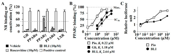 The target identification of butyrolactone I was performed due to a lack of correlation between the adiponectin production-enhancing activities and CDK5 inhibitor efficacies. Adiponectin biosynthesis is regulated by nuclear receptors, such as PPARα, PPARγ, PPARδ, GR, ER, and LXR [21,22]. To determine whether butyrolactone I directly affected these nuclear receptors, time-resolved fluorescence resonance energy transfer (TR-FRET)-based nuclear receptor binding assays were performed (Figure 3). In a TR-FRET assay, butyrolactone I significantly bound to PPARγ but did not affect specific ligand binding to PPARα, PPARδ, GR, or LXR. In contrast, roscovitine did not replace ligand binding to any nuclear receptor evaluated in this study (Figure 3A). In a concentration-dependent analysis of PPARγ binding, the Ki value of butyrolactone I was 2.64 μM, which was lower than those of a PPARγ full agonist pioglitazone (Ki 0.22 μM) and a PPARγ-binding sulfonylurea antidiabetic glibenclamide (Ki 1.18 μM) (Figure 3B). To determine the PPARγ binding activity of butyrolactone I with its functional association, butyrolactone I-induced PPARγ transactivation was measured with a cell-based PPARγ luciferase reporter transactivation assay. Butyrolactone I significantly increased PPARγ transactivation in a concentration-dependent manner; however, its maximum activity was not as potent as that of pioglitazone, supporting that butyrolactone I may be a PPARγ partial agonist (Figure 3C).