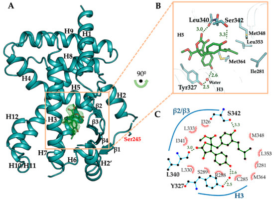 To elucidate the binding mode of butyrolactone I to PPARγ, the crystal structure of PPARγ LBD in complex with butyrolactone I was determined at 2.1 Å resolution (Table 1). The crystal structure of butyrolactone I-bound PPARγ LBD adopted the canonical nuclear receptor fold consisting of three layers of 13 α-helices and 4 stranded β-sheet (Figure 4A). There were two protein molecules in an asymmetric unit, which were nearly identical to the previously published PPARγ LBD structure (Protein Data Bank (PDB) ID: 1PRG) with a root-mean-square deviation (RMSD) of 0.66 Å over 503 equivalent Cα atoms [48]. The ligand omit map calculated from the refined model clearly showed electron densities to model butyrolactone I (Figure 4A, Supplementary Figure S3). Butyrolactone I was bound to the canonical ligand-binding pocket (LBP) via three hydrogen bonds and hydrophobic effects (Figure 4B). The oxygen atom of the benzyl group and the oxygen atom of the lactone group in butyrolactone I formed hydrogen bonds with Oγ atom of Ser342 (hydrogen bond distance 3.3 Å) and with the backbone oxygen atoms of Leu340 (hydrogen bond distance 3.0 Å), respectively. The oxygen atom of hydroxylphenyl group in butyrolactone I participated in a water-mediated hydrogen bond with Oη atom of Tyr327 (hydrogen bond distances 2.6 Å and 2.5 Å). The hydrophobic effects of butyrolactone I were presented mostly with H3, H5, and β-sheet of PPARγ LBD, including Ile281, Cys285, Arg288, Ser289, Ala292, Ile326, Leu330, Leu333, Ile341, and Met364 (Figure 4C). In particular, the 3-methyl-2-butenyl group of butyrolactone I was surrounded by hydrophobic residues, including Ile281, Met348, Leu353, and Met364, which formed a hydrophobic pocket (Figure 4B). On the contrary, butyrolactone I did not directly interact with the Oη atom of Tyr473 on H12 that is known for the major interactive motif of the PPARγ full agonist in PPARγ LBD [48].