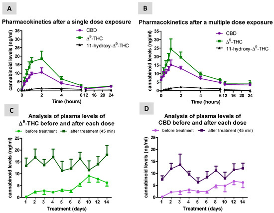 Our data indicated that Sativex was well-tolerated and did not produce any relevant effect on the neurological status, despite some neurological signs (e.g., ataxia) observed in the aforementioned study using different doses of the 1.08:1 ratio of Δ9-THC and CBD extracts administered orally to dogs [31]. However, it is important to remark that these signs were found at conditions that were significantly different (higher doses of the 1.08:1 ratio of Δ9-THC and CBD extracts and/or after more than 50 weeks of daily administration [31]) compared to those used in our present study, leading to plasma levels of approximately 200 ng/mL of CBD (20 fold higher than in our study) and 60 ng/mL of Δ9-THC (3 fold higher). In our study, no relevant effects were found for body temperature, respiratory function and hemodynamic values of the dogs, which, in general, are concordant (e.g., absence of tachypnoea) with the study conducted with different doses of the 1.08:1 ratio of Δ9-THC and CBD extracts administered orally to dogs [31]. Our data also indicated that the maximal levels in the plasma of the two abundant phytocannabinoids mixed in Sativex were achieved 2 h after the single dose treatment and earlier (at 1 h) after 14 days of daily administration. Our data also suggested a progressive elevation of both CBD and Δ9-THC levels as the multiple dose treatment progresses, with the pre-dose and post-dose values tending to become progressively closer. In general, this is the consequence of the elevation of daily pre-dose values. This potentially reflects their distribution and accumulation in fat tissues (and also in other organs) immediately after treatment and their progressive and slow release from these tissues when plasma levels tended to be significantly reduced (approximately 4 h after treatment) [37], although other explanations (e.g., reduced metabolism) cannot be ruled out. This fact, as well as the data obtained for Cmax and tmax in our study are, in general, equivalent to the results obtained in pharmacokinetic studies conducted previously in laboratory rodents and, in particular, in humans [33,34,35]. Finally, our results also indicated that the major Δ9-THC metabolite, 11-hydroxy-Δ9-THC, which is mainly formed in the liver by the action of the cytochrome P450 complex, presented at very low levels in the plasma, and this should be also the case with some classic metabolites of CBD (e.g., 7-hydroxy-CBD), despite they were not analyzed in this study. This is in agreement with the use of a sublingual delivery for administration; furthermore, the well-known food effect on phytocannabinoid absorption may also be a contributing factor, since food deprivation of our dogs may have reduced gastrointestinal absorption.