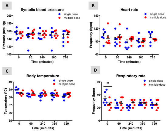 Effects of the single dose and multiple dose treatment with Sativex, delivered by sublingual administration (3 consecutive sprays equivalent to 8.1 mg of Δ9-THC and 7.5 mg of CBD), to naïve dogs on their systolic blood pressure (A), heart rate (B), body temperature (C) and respiratory rate (D). Values are means ± SEM of 6 animals per group. Data were assessed by using two-way ANOVA followed by the Bonferroni test (* p < 0.05 versus the single dose treatment).
