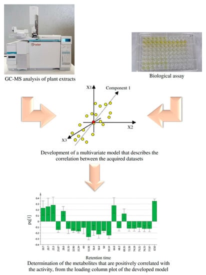 Metabolic fingerprinting and metabolite profiling are the main strategies followed in plant metabolomics studies. The former uses non-specific analytical platforms to obtain a spectral fingerprint of all metabolites present in the sample (no information is gained about the identity of those metabolites), while the latter identifies (and sometimes quantifies) a pre-defined set of related metabolites, such as those involved in a specific metabolic pathway or those responsible for certain bioactivity []. Mass spectrometry has been used successfully for both strategies. An unhyphenated mass spectrometer is a universal detection tool that has been used for data acquisition in metabolic fingerprinting studies. Moreover, when attached to a chromatographic unit (e.g., gas chromatograph, high performance liquid chromatograph or ultra performance liquid chromatograph), mass spectrometry can be used for metabolite profiling purposes. In such a case, the metabolites are introduced into the ionization chamber sequentially instead of concomitantly, enhancing the quality of the acquired mass spectral data (i.e., better sensitivity and reduced background noise) leading to better qualitative and quantitative results []. GC–MS-based metabolomics has been used for profiling of the active metabolites from Clinacanthus nutans [], Cosmos caudatus [], Camellia sinensis [], Achras sapota [], and from selected commercial essential oils []. Figure 1 summarizes the procedure followed in the aforementioned studies. Generally, it involves the GC–MS analysis as well as the assessment of the activity of the different samples. The datasets acquired during metabolomics studies are usually complex (i.e., have multiple variables and observations), hence they require sophisticated statistical tools for their analysis; namely multivariate data analysis (MVDA). MVDA tools rely on the concept of dimensionality reduction to mine the meaningful correlations between the X-variable (e.g., mass spectral data) and the Y-variable (e.g., bioactivity). Partial least squares (PLS) is an MVDA tool that forms new X-variables (referred to as latent variables) that are linear combinations of the old ones and give a good correlation with the Y-variable at the same time. The first PLS component describes more variation of the X-variables and predicts more variation of the Y-variable than the second PLS component, and so on. An orthogonal partial least squares (OPLS) algorithm is an extension of the PLS algorithm that separates the variation in X into two parts, one that is related to Y (called predictive component) and one that is unrelated to Y (called orthogonal components) []. The active metabolites are further identified from the loading column plot of the developed multivariate model, where their representative columns are shown to be positively correlated with the activity. Murugesu et al. reported the metabolites namely; palmitic acid, 1-monopalmitin, pentadecanoic acid, hexadecanoic acid, heptadecanoic acid, phytol, stigmasterol, stigmast-5-ene, glycerol monostearate, 1-linolenoyl glycerol and alpha-tocospiro B to be responsible for the α-glucosidase inhibitory activity of C. nutans leaves extracts. On molecular docking, these putative active metabolites displayed predicted binding energies of −3.75 to −9.09 Kcal/mol, with stigmast-5-ene, stigmasterol and alpha-tocospiro B showing better affinities compared to the control ligand and the positive control, quercetin []. Similarly, Javadi et al. reported the metabolites namely; catechin, α-d-glucopyranoside, α-tocopherol and α-linolenic acid to elicit the α-glucosidase inhibitory activity of C. caudatus leaves extracts []. Furthermore, Das et al. reported that chlorogenic acid and gallic acid were responsible for the α-glucosidase inhibitory activity of A. sapota fruit extracts [].
