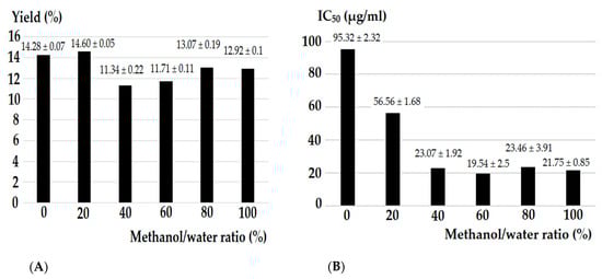 Extraction yield (%) (A) and α-glucosidase inhibitory activity (IC50; µg/mL) (B) of T. scandens leaves hydromethanolic extracts. Values expressed as the mean ± standard deviation of six replicates. IC50 value of the positive control (Quercetin) was 3.29 ± 0.48 µg/mL.