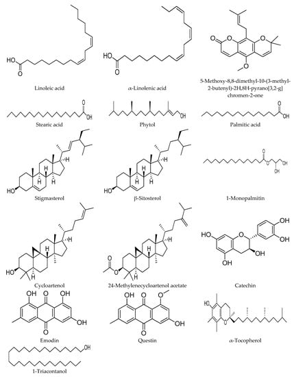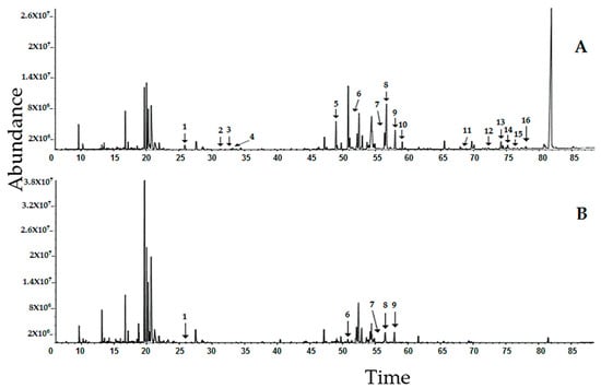 Representative chromatogram of the methanol extract (A) and water extract (B) of T. scandens leaves. Peak assignments: 1—palmitic acid, 2—phytol, 3—linoleic acid, 4—α-linolenic acid, 5—1-monopalmitin, 6—5-methoxy-8,8-dimethyl-10-(3-methyl-2-butenyl)-2H,8H-pyrano[3,2-g] chromen-2-one, 7—stearic acid, 8—questin, 9—emodin, 10—catechin, 11—α-tocopherol, 12—stigmasterol, 13—β-sitosterol, 14—1-triacontanol, 15—cycloartenol, 16—24-methylenecycloartenol acetate.