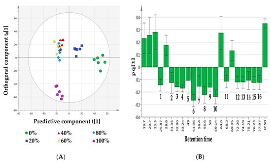 Representative GC–MS chromatograms of the methanol and water extracts of T. scandens leaves are displayed in Figure 3. Correlation of the mass spectral data (X variable = 2689 features) and the α-glucosidase inhibitory IC50 values (Y variable = 1) collected from 36 extracts (observations) resulted in the development of a multivariate OPLS model with one predictive component and five orthogonal ones (1 + 5 + 0). The highly active T. scandens extracts (i.e., 100%, 80%, 60% and 40% methanol extracts) and the less active ones (i.e., 20% methanol extracts as well as water extracts) were nicely discriminated from each other by the predictive component t [] as shown in the scores scatter plot (Figure 4A), with the highly active extracts on the negative side and the less active extracts on the positive side. Moreover, the orthogonal component t0 [] further separates the methanol extract from the other highly active extracts, which may indicate compositional differences between methanol extract and the other highly active extracts. The developed model was considered valid since the values of R2Y (cum) and Q2Y (cum) were above 0.5 (0.973 and 0.921, respectively) and the values of root mean square error of estimation (RMSEE) and root mean square error of cross validation (RMSEcv) were low (5.118 and 7.850, respectively) [,,]. The supplementary plot (Figure S1) displays the regression line between the observed IC50 values and the IC50 values predicted based on the developed model. A regression coefficient (R2) value of 0.9729 indicates high accuracy of the developed model.