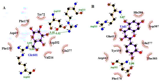 The 3D structures (sdf files) of the putative active metabolites, as well as quercetin (positive control), were obtained from PubChem (https://pubchem.ncbi.nlm.nih.gov/). The crystal structure of maltose–Saccharomyces cerevisiae isomaltase complex (pdb file) was downloaded from Protein Data Bank (http://www.rcsb.org/) (PDB ID: 3A4A) [,,]. The protein (pdb) file was first processed by AutoDock Tools 1.5.6 (The Scripps Research Institute, La Jolla, CA, USA) to remove water molecules and to add hydrogen atoms []. The processed pdb file was separated into two pdb files, one for the enzyme (isomaltase) and one for the ligand (maltose). The enzyme’s file was further readjusted (in terms of the added hydrogens and the assigned atomic charges) according to the pH value used during the in vitro α-glucosidase inhibition assay (i.e., pH 6.5) using the PDB2PQR server (http://nbcr-222.ucsd.edu/pdb2pqr_2.0.0/) (National Biomedical Computation Resource, San Diego, CA, USA). The resulting pqr file was converted again to the pdb format using PyMol software (V 1.7.4, Delano Scientific, San Carlos, CA, USA), then the metal (Ca) line was added. Thereafter, the pdb files of both the ligand and the enzyme were converted into pdbqt format, the format needed for running the molecular docking job on AutoDock Vina. The docking method was validated via control docking of the experimentally bound ligand (i.e., maltose) before proceeding to dock the putative active metabolites [,]. The residues Asp215, Glu277 and Asp352 were reported to form the active site of the enzyme []. The control docking was repeated until the dimensions of the grid box were optimized. Eventually, the docking grid box was centered on the macromolecule (X, Y and Z coordinates of 21.284, −0.761 and 18.638 respectively) and its dimensions were set at 28 Å X 28 Å X 28 Å with a spacing of 1 angstrom. The docking job was performed with AutoDock Vina and the interactions in the ligand–enzyme complexes were visualized using LigPlot+ v.1.4.5 (European Bioinformatics Institute, Hinxton, Cambridge, UK). (Please see the supplementary File S1 for detailed information.)