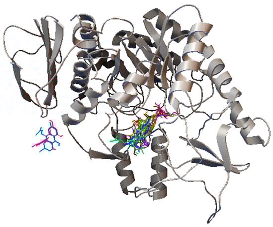 The superimposed 3D diagram showing all the putative active metabolites as well as quercetin, docked into the active site of Saccharomyces cerevisiae isomaltase. The 2 metabolites away from the remaining overlapped metabolites are 5-methoxy-8,8-dimethyl-10-(3-methyl-2-butenyl)-2H,8H-pyrano[3,2-g] chromen-2-one and catechin.