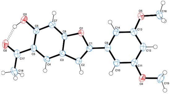 We were able to obtain single crystals of the 3,5-dimethoxyphenyl substituted derivative 2h suitable for X-ray diffraction analysis by slow evaporation of ethanol. CCDC 1975570 contains the supplementary crystallographic data of 2h, which can be obtained free of charge from The Cambridge Crystallographic Data Centre via www.ccdc.cam.ac.uk/data_request/cif. The structure of these compounds was confirmed in the solid state by single crystal X-ray diffraction technique, which confirmed that the crystal structure contains one molecule in the asymmetric unit. Single crystal structure of 2h is included as Figure 1 and the crystallographic numbering has been used in the context of the X-ray analysis. Compound 2h crystallizes in the P21/n space group. The molecule is essentially planar with a six-membered intramolecular hydrogen bonding interaction between the oxygen acceptor (O3) and the hydroxyl group with hydrogen bond distance, dO(3)-H(3)...O(2) = 1.64 Å. The 3,5-dimethoxyphenyl substituent is also in co-planarity with the 5-acetyl-6-hydroxybenzofuran framework.