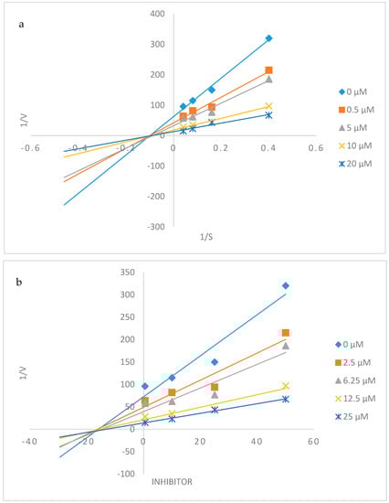 Lineweaver–Burk (a) and Dixon (b) plots for the inhibition of α-glucosidase by 2h.