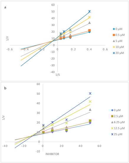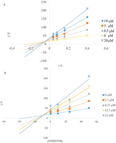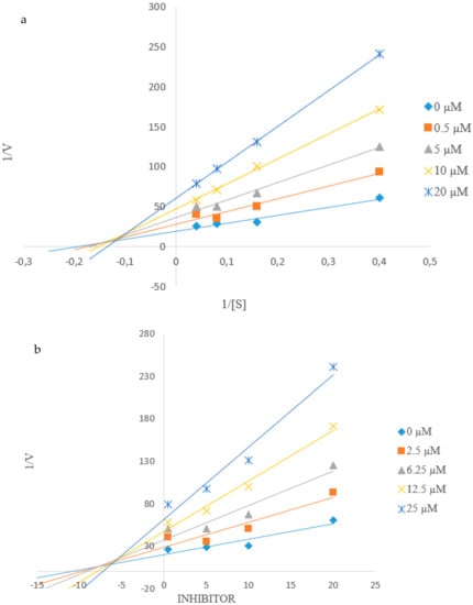 The kinetics studies on compounds 2c and 2h were performed according to the reaction conditions in 2.3.1 with inhibitors of various concentrations (0.5, 5, 10, 20 µM) and the ranges of final substrate concentration were 0–25 µM. The type of inhibition was determined by using Lineweave-Burk plot (the inverse of velocity (1/v) against the inverse of the substrate concentration (1/[S]). The inhibitor constant was obtained by Dixon plot (the inverse of velocity (1/v) against concentration of inhibitor at each substrate concentration).