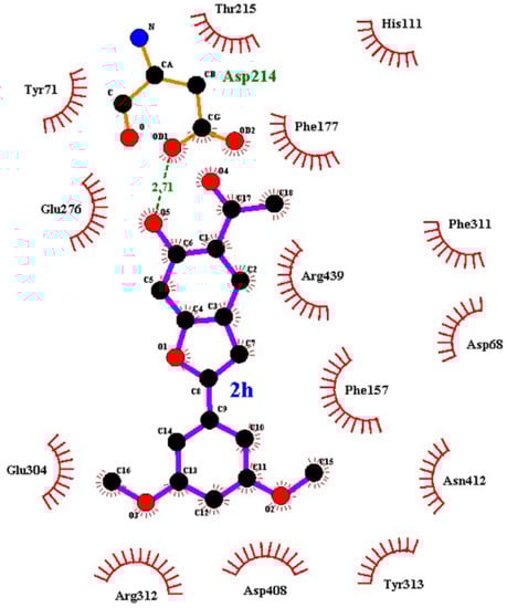 The control docking of glucose towards the built model of α-glucosidase with root mean square deviation (RMSD) of 0.98 Å with the glucose in β-glucosidase crystal structure (PDB ID 3A4A) showed the appropriateness of the docking parameters. Figure S4 (in SI) shows all compounds docked in similar conformation with the ortho-hydroxyacetylbenzofuran framework positioned deep into the binding site, while the phenyl substituent extended nearer to the binding site entrance. The calculated binding energies (kcal/mol) for these compounds are listed in Table 3. The binding energies values obtained through molecular docking do not always correlate well with the biological response observed in the in vitro tests []. Nevertheless, the interaction studies between the ligand and protein are useful in rationalizing SAR and for future ligand optimization. Compounds 2g and 2h have the most favourable binding free energy (−6.92 kcal/mol) compared with other test compounds in this study (Table 3). With more than 0.5 kcal/mol binding free energy better than the substrate (glucose), compounds 2g and 2h are therefore expected to be able to compete with glucose for the binding site, thus able to inhibit α-glucosidase. Further analysis of the interactions of compound 2h with α-glucosidase showed that the favourable binding affinity is contributed by one hydrogen bond and 14 hydrophobic contacts (Figure 6). The α-glucosidase Phe177, Phe311 and Tyr71 formed stable π-π interactions with compound 2h benzofuran region while Tyr313 stabilized compound 2h dimethoxybenzene region.