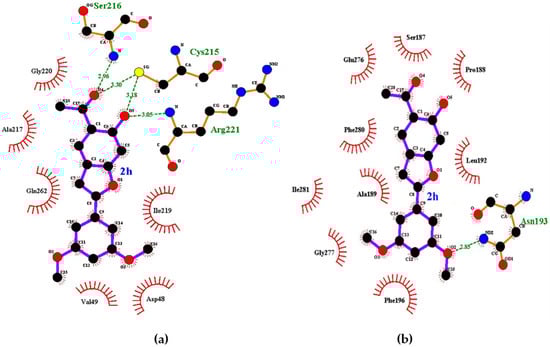 The docking of control ligand showed reproducibility of crystal structure where the RMSD values are 1.51 Å and 1.23 Å in PTP1B catalytic (PDB ID: 1NNY) and allosteric (PDB: ID 1T49) site, respectively. A number of small molecules and peptides have shown in vitro and in vivo PTP1B inhibition activity either by binding to the active site or to the allosteric site of this enzyme []. Inhibition by targeting the catalytic domain of PTP1B resulted in the inhibition of other protein tyrosine phosphatases family members and therefore significant undesirable off target side effects []. It is envisaged that these challenges can be circumvented by targeting the less conserved sites, such as the allosteric site and side pockets present at the borders of the catalytic site [,]. Allosteric inhibitors become accommodated into α3-α6-α7 helices destabilizing the network of hydrogen bonds essential for the closure of WPD loop, thereby prohibiting the closure of this loop [,]. All the docked test compounds adopted very similar conformation with the benzofuran region positioned deeper into the catalytic site of PTP1B (see Figure S5(a) in SI) while in the allosteric site of PTB1B, all test compounds docked at the benzofuran site of the crystal ligand (refer to Figure S5(b) in SI). The binding affinity of all test compounds are comparable and did not show significant differences in PTP1B catalytic site (Table 4). However, these compounds showed variable binding affinities to the allosteric site of PTP1B, which may suggest that these compounds are bidentate ligands capable of binding to the catalytic site and to the allosteric site as well. The docking poses of 2a–h in the catalytic and allosteric sites are represented below by the docked structure of 2h in Figure 7a,b, respectively. This compound has the most favourable binding free energy (−7.50 kcal/mol) in PTP1B allosteric site compared with other derivatives (Table 4). Compound 2h formed a total of four hydrogen bonding and six hydrophobic contacts in PTB1B catalytic site but without any π-π interaction. Hydrogen bonding interactions probably increase the residence time of this compound in the active site of PTP1B and therefore increased activity against this enzyme. Although only one hydrogen bond was detected between compound 2h and PTP1B allosteric site, the affinity of compound 2h was favoured by nine hydrophobic contacts (Figure 7b). In addition, the π-π interactions between PTP1B protein residue, Phe196, with dimethoxyphenyl moiety of compound 2h and Phe280 with its benzofuran scaffold increased the binding affinity of this compound with 59PTP1B allosteric site. The predicted increased hydrophobic interactions of 2h with protein residues in the allosteric site are consistent with the increased inhibitory effect of this compound. The formation of the hydrogen bond of 2h with the protein residue Asn193 in the helices of α3–α6 presumably constrains the WPD loop to its open conformation, in turn, inactivates PTP1B. Molecular docking and kinetic data confirm inhibition of 2h to be more selective for the allosteric site). Literature precedents have confirmed this allosteric site to make such inhibitors highly selective for PTP1B over other PTPs [,,,].