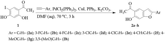 The above-mentioned compounds were accessible via tandem Sonogashira cross-coupling and Cacchi-type heteroannulation of the known 2,4-dihydroxy-5-iodoacetophenone (1) []. The latter was subjected to phenylacetylene derivatives in the presence of dichlorobis(triphenylphosphine)palladium(II)-copper iodide catalyst mixture, triphenylphosphine as ligand and potassium carbonate as a base in aqueous dimethylformamide at 70 °C (Scheme 1). We isolated in each case after 3 h by aqueous work-up and purification by column chromatography on silica gel the homo-coupled dimer and the cross-coupled product in sequence. The cross-coupled products were characterized using a combination of NMR (1H- and 13C-), IR and mass spectrometric techniques as the ortho-hydroxyacetyl substituted 2-arylbenzofurans 2a–h. The 1H-NMR and 13C-NMR spectra of these compounds obtained as CDCl3 solutions (Figure S1 in the Supplementary Information, SI) revealed the presence of an intense singlet around δ 2.70 ppm for the methyl group and increased number of signals in the aromatic region as well as a broad singlet for the hydroxyl proton around δ 12.52 ppm. No deuterium exchange occurred in CDCl3–D2O mixture presumably due to strong intramolecular hydrogen bonding of this hydroxyl proton with the carbonyl oxygen. The 13C-NMR spectra of these compounds, on the other hand, lacked a set of singlets in the region δ 80–100 ppm typical for the acetylene moiety, which confirmed cycloisomerization.
