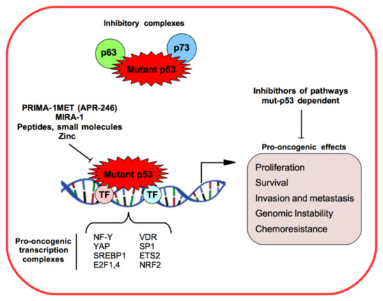 The mut-p53 protein does not recognize and bind to p53 DNA binding consensus elements and it loses the transcriptional activity towards wt-p53-regulated target genes [8,9,10]. However, mut-p53 proteins are able to aberrantly regulate the transcription of some genes through different mechanisms from wild-type p53, as binding other transcriptional factors and cofactors practically parasitizing their binding sequences onto the target gene promoters [8,9,10] (Figure 1). For example, mut-p53 can interact with NF-Y, SREBP, VDR, Sp1, ETS2, E2F4, YAP, and NRF2 transcription factors, and enhance or decrease their transcription activities to promote tumor progression and spread [8,9,10,11,12,15,16,17,18,19] (Figure 1).