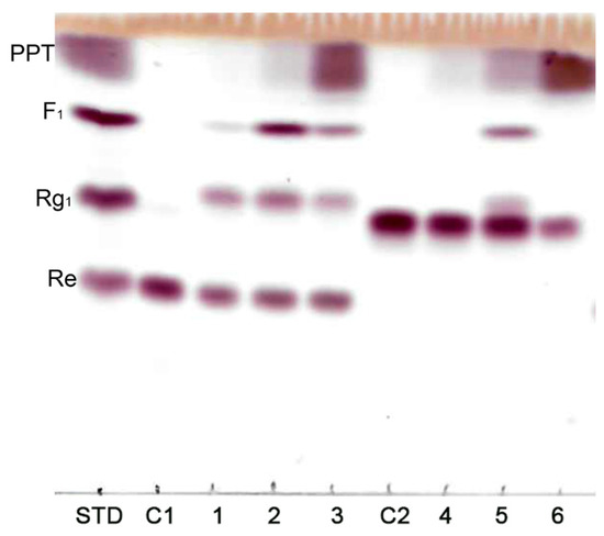 Thin layer chromatography of hydrolyzation products by MT619. C1, Re; 1, Re transformation products; 2, Re transformation products with F1 added; 3, Re transformation products with PPT added; C2, Rg2(S); 4, Rg2(S) transformation products; 5, Rg2(S) transformation products with F1 added; 6, Rg2(S) transformation products with PPT added.