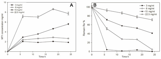 Effects of the substrate Re concentrations (A) and remaining Re concentrations (B) in the reaction mixture.