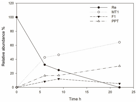The relative abundance of ginsenosides Re, MT1, F1 and PPT in a scaled-up production reactor over time.