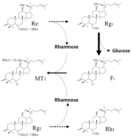 Based on the above experimental results, the conversion pathways were deduced as shown in Figure 6. In the conversion of Re, the rhamnopyranoside moieties were released from the substrates and transformed into the C-20 outer glucopyranoside of ginsenoside F1. When MT619 reacted with Rg2, the rhamnosyl transformation could only occur with the existence of the attached glucopyranoside at C-20 positions such as F1. The mechanisms of rhamnose transformation by MT619 warrant further exploration.