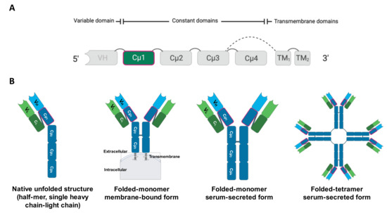 General molecular structure and alternative splicing pattern of the IgM heavy chain in teleost fish (A). Comparison among teleost immunoglobulin isoforms, which are generally expressed in membrane-bound form (B cell receptor) or as a secreted native unfolded-half-mer structure, folded-monomer, or folded-tetramer in the serum (B).