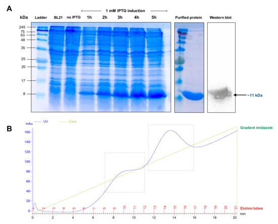 The IgMH Cμ1 protein was overexpressed in a bacterial expression system using E. coli BL21(DE3). Sodium dodecyl sulfate-polyacrylamide gel electrophoresis (SDS-PAGE) revealed that the Cμ1 protein was well expressed after isopropylthio-β-galactoside (IPTG) induction from the first hour of induction, with a distinct band at approximately 11 kDa (Figure 3A). This result is consistent with the predicted molecular weight as previously described. High purity of the Cμ1 protein was obtained after purification with the HiTrapTM Chelating HP system (Figure 3A,B).