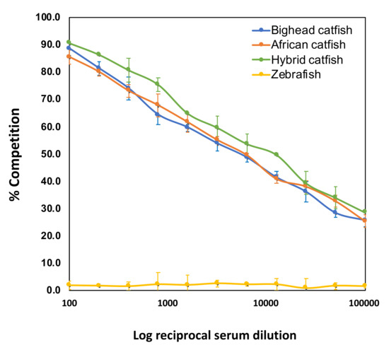 The new IgMHCμ1 mAb of bighead catfish was optimized for the prior ELISA using standard checkerboard titration (CBT). The optimum concentration of purified antigen CH1 protein and serum dilution of the sample were 32 ng/mL/well and 1:320, respectively. Furthermore, the optimum dilutions of the IgMHCμ1 mAb and secondary HRP-conjugated goat anti-rabbit IgG were 1:51,200 (20 ng/mL/well) and 1:12,400 (40 ng/mL/well), respectively. The c-ELISA results revealed that the IgMHCμ1 mAb was highly specific to all tested catfish, including bighead catfish, African catfish, and hybrid catfish, at all tested serum dilutions. Furthermore, no competition was observed in zebrafish at any serum dilution (Figure 4).