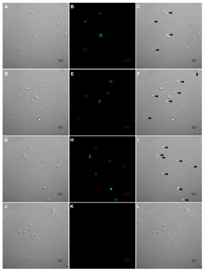 The detection of IgM+ cells using mAb IgMHCμ1 through the IIFAT revealed specific fluorescence signals in the intracellular regions and on the cell membranes (Figure 6) of healthy bighead catfish (Figure 6A–C), African catfish (Figure 6D–F), and hybrid catfish (Figure 6G–I). The results indicate that the IgMHCμ1 mAb could specifically recognize both intracellular and membrane-bound forms of IgM molecules in lymphocytes. No reactivity of mAb IgMHCμ1 was found in the PBLs of zebrafish (Figure 6J–L).