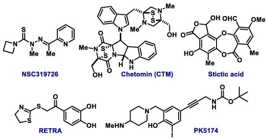PK5174 is also a noteworthy compound with good affinity for the Y220C mutant p53 that inhibits its aggregation by acting on specific points in the p53 core domain (Figure 3). Interestingly, in this compound the ethynyl group is a nonclassical bioisostere to iodine, forming halogen bonds within the protein pocket [,]. Chetomin (CTM), a natural product extracted from the fungus Chaetomium cochliodes, which has antibacterial and antifungal properties [], restores the Hsp40-p53 axis in a R175H mutant model and p53 MDM2-dependent degradation (Figure 3) []. Thiosemicarbazones are also a very important class of compounds, with some of them having reached clinical trials stage. Compound NSC319726, for instance, has restored effectively the function of R175H mutant p53 with extensive apoptosis induction [].