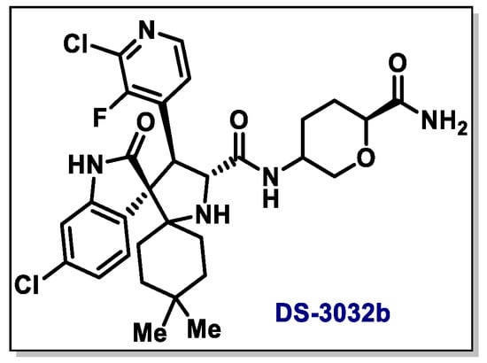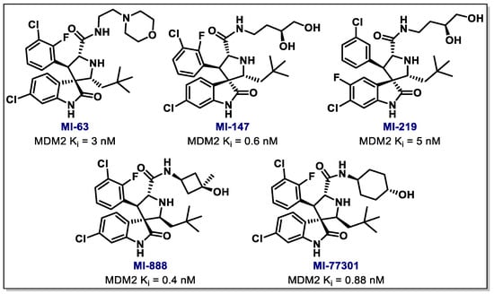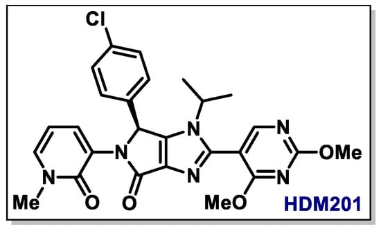 MDM2 (murine double minute 2), also known as E3 ubiquitin-protein ligase MDM2 or HDM2, is an important negative regulator of WTp53 in normal cells. In tumors, it acquires an oncogenic role due to its overexpression that leads to WTp53 inactivation. This biological target has been highly investigated to restore p53 activity, and also has the largest set of small molecule inhibitors. Moreover, MDM2 is the therapeutic target with the highest number of substances in clinical trials against various types of cancer in humans []. Thus, the disruption of the MDM2-p53 protein complex is a promising strategy for the treatment of various types of cancer via the restoration of WTp53 function. Indeed, a compilation of patents on small molecule MDM2 inhibitors has been recently published [] and a critical discussion on the biological rationale of these strategies have also been conducted [,].
