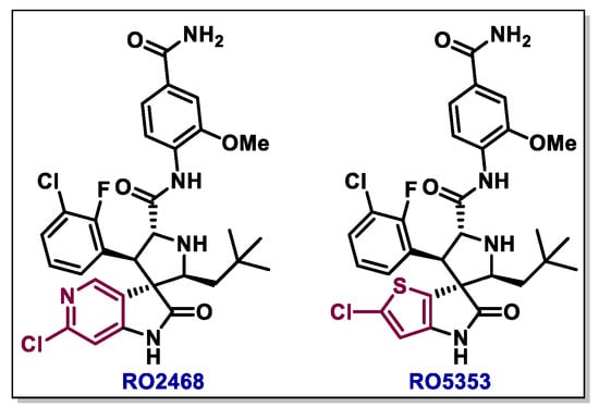- Zhang, Z.; Chu, X.J.; Liu, J.J.; Ding, Q.; Zhang, J.; Bartkovitz, D.; Jiang, N.; Karnachi, P.; So, S.S.; Tovar, C.; et al. Discovery of Potent and Orally Active p53-MDM2 Inhibitors RO5353 and RO2468 for Potential Clinical Development. ACS Med. Chem. Lett. 2014, 5, 124–127. [Google Scholar] [CrossRef]