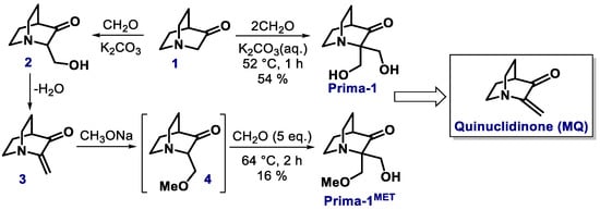 The synthesis of PRIMA-1 is reported in patents, in which the quinuclidinone hydrochloride 1 is used as the starting material (Scheme 1). The synthesis of PRIMA-1 is achieved by the treatment of 1 with an excess of formaldehyde and potassium carbonate. As for PRIMA-1MET, it is also synthesized from 1, but in this case, 1 is treated with 1 equivalent of formaldehyde and potassium carbonate to form 2. The dehydration of 2 gives compound 3, which, upon treatment with sodium methoxide, affords 4 (not isolated), followed by a treatment with formaldehyde, which delivers PRIMA-1MET [].