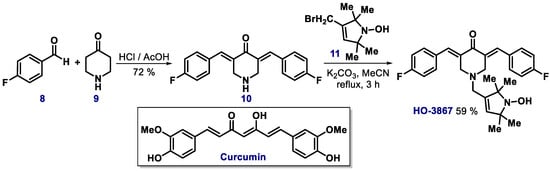 Another class of compound that has shown promising results are N-alkylated and N,N-dialkylated 3,5-bis-(arylidene)piperidones, which are obtained from 4-piperidone []. Such molecules have been shown to have high activity against the A549 resistant human lung carcinoma cell line and are structurally related with the natural compound curcumin, which is the main component of the rhizome of Curcuma longa and has proved to be a powerful chemopreventive and anticancer agent, with several other reported biological activities. Further research in this area identified a series of synthetic curcumin analogs containing two arylidene-α-carbonyl units and a nitroxide group []. These compounds, which bear two structural antioxidant moieties, showed efficacy and selectivity in killing cancer cells A2780, MCF-7, and H9c2 by converting mutant p53 to a transcriptionally active WTp53-like form []. The central strategy was to combine the anticancer properties of curcumin derivatives and the antioxidant capacity of the nitroxide groups, which has the ability to reduce damage caused by ROS. Among the synthesized compounds, a very active one was identified and denominated as HO-3867. The synthetic route to HO-3867 involves a Claisen–Schmidt condensation between 4-piperidone hydrochloride 9 and p-fluorobenzaldehyde 8 giving 10, which leads to the product HO-3867 after alkylation with substituted pyrrol 11 (Scheme 3).
