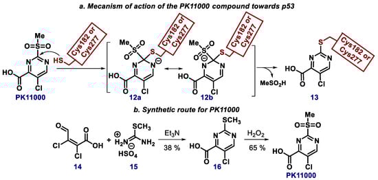 Also considering that small molecules that act as Michael acceptors have the ability to react covalently with cysteine residues of mutant p53 without compromising its binding to DNA, Fersht et al. demonstrated that 5-chloro-2-(methylsulfonyl) pyrimidine-4-carboxylic acid, the so-called PK11000, increases the thermal stability of mutant p53 by reacting with cys182 or cys227 (Scheme 4a) [,]. Sulfonylpyrimidines are electrophilic compounds capable of reacting with nucleophiles, for example thiols, forming structures such as 13; indeed, K11000 has shown to be a potent and selective alkylating agent, and is currently being targeted in a preclinical investigation for the therapy of patients with triple negative breast cancer []. PK11000 is a commercially available compound and its synthesis can be accomplished via the reaction of dichlorooxobutenoic acid 14 with thiocompound 15 followed by oxidation of intermediate 16 with hydrogen peroxide (Scheme 4b) [].