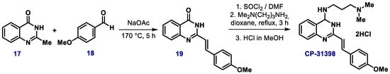In a similar path, styryl quinazoline compound CP-31398, which contains a double bond conjugated between a benzene and a quinazoline ring, has also been able to stabilize the active conformation of mutant p53 []. This compound inhibits the growth of small human tumor xenografts in vivo and in tobacco-induced lung cancer. Recently, it was demonstrated that CP-31398 is a p53-modulating agent with potential to act as a chemopreventive agent for different cancer types [,,,]. The synthesis of CP-31398 was reported by Sutherland and co-workers in 2012 (Scheme 5); in this route, the condensation reaction between quinazolinone 17 and 4-methoxybenzaldehyde 18 in the presence of sodium acetate gives the styryl quinazoline 19, which after a chlorination/substitution reaction sequence leads to CP-31398 [].
