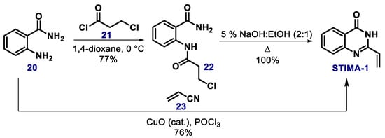 Another very promising compound for the reactivation of p53 via covalent modification is 2-vinylquinazolin-4-(3H)-one, the so-called STIMA-1 (Scheme 6) []. Similarly, the activity of this compound is related to the exogenous olefin group that can act as a Michael acceptor. Zach and co-workers found that STIMA-1 is more potent than CP-31398 in suppressing the growth of mutant p53-containing tumor cells []. In this sense, there are two reported synthetic approaches towards STIMA-1 using anthranilic acid derivative 20 as starting material. In the method developed by Witt and Bergman, 3-chloropropionyl chloride 21 is used to prepare 2-(3-chloropropionylamino)-benzamide 22, which upon cyclization and dehydrohalogenation with sodium hydroxide in ethanol gives STIMA-1 (Scheme 6) []. Another approach was described recently by Abe and co-workers, and consists in a one-pot copper-catalyzed Ritter-type reaction with acrylonitrile 23 to achieve the same molecule (Scheme 6) [].