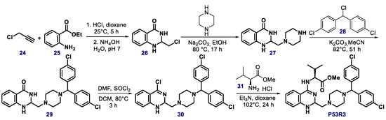 P53R3 is a quinazoline-type molecule which was originally identified using p53 DNA binding assays []. This compound restores sequence-specific DNA binding to several p53 hot spot mutants, but also improves the recruitment of wild-type p53 to target gene promoters. The synthesis of P53R3 was described back in 2007 in a patent by Mallams and co-workers (Scheme 7) []. 2,3-Dihydroquinazolinone 26 is obtained through the cyclization reaction between propargyl chloride 24 and ethyl 2-aminobenzoate 25. Next, 26 is reacted with piperazine to form intermediate 27, which gives 29 after treatment with 4,4’-(chloromethylene)bis(chlorobenzene) 28 in basic medium. The chlorination of 29 then leads to 30, which is converted to P53R3 after reaction with L-valine methyl ester 31.