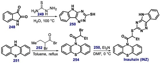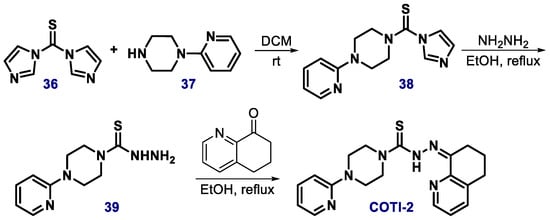 COTI-2, a thiosemicarbazone derivative, is another molecule which has showed promising activity in reactivating p53 (Scheme 9) []. Indeed, a phase 1 clinical trial in gynecological cancers is currently ongoing []. Although the mechanism of action of COTI-2 is not yet completely known, it has been already shown that this compound binds both to full length and DNA-binding domain of mutant p53, leading to the refolding of the mutant protein []. COTI-2 can be synthetized from the reaction of 1,1’-thiocarbonyldiimidazole 36 with N-(2-pyridyl) piperazine 37, giving 38 as intermediate. Next, 38 is reacted with hydrazine to furnish 39, which undergoes an addition reaction with 6,7-dihydro-5H-quinolin-8-one, giving the desired product [].