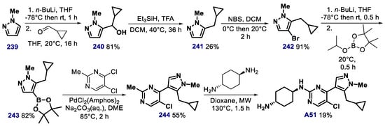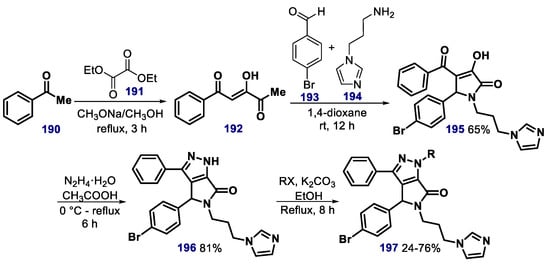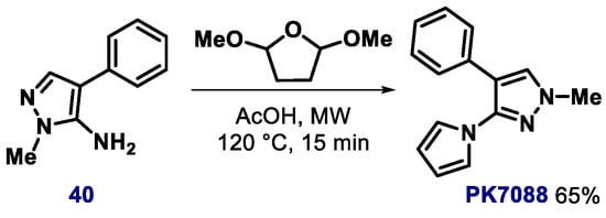 Recently, Fersht and co-workers identified a family of hybrid 1H-pyrrole-1H-pyrazole heterocycles from which compound PK7088 was highlighted, being biologically active in vitro against cancerous cells carrying the Y220C mutant p53 protein. Assays indicated that the PK7088 molecule increased the amount of WTp53 levels and restored its transcriptional functions and apoptosis []. This compound was identified in a library obtained by combinatorial chemistry, and was synthesized in four steps from 2-(4-fluorophenyl) acetonitrile; the key step was the synthesis of the pyrazole ring from 2-(4-fluorophenyl)-3-oxopropanenitrile via condensation with hydrazine. As for the construction of the pyrrole ring, it was achieved using the classic Paal-Knorr method from 40 (Scheme 10).