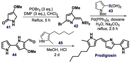 Prodigiosin is a tripyrrole red pigment member of the prodiginine family; it is a secondary metabolite of the human pathogen Serratia marcescens []. This compound has been receiving growing attention owing to its reported antimicrobial, immunosuppressive, and anticancer properties. In 2014, El-Deiry and co-workers reported that prodigiosin is a promising p53 reactivator, restoring a deficient p53 signaling pathway and producing antitumor effects via a dual mechanism which involves p73 upregulation and disruption of the mutant p53/p73 complex. The first report on the total synthesis of prodigiosin dates back to 1962 [], but other approaches have also been reported []. Tripathy, Lavallée and co-workers, for instance, reported the synthesis of fragment 42 via the reaction of 4-methoxy-3-pyrolin-2-one 41 with DMF in the presence of POBr3 followed by the Suzuki cross-coupling between 42 and boronic acid 43 (Scheme 11) []. Finally, fragment 43 is coupled with pyrrol 45 in acidic medium, giving prodigiosin as product.