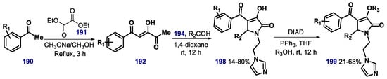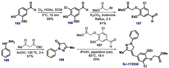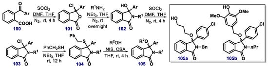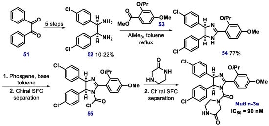The synthesis of Nutlins was initially reported in patents by Hoffmann-La Roche, in which the authors describe their synthesis from benzil 51 as a racemic mixture (Scheme 14) [].