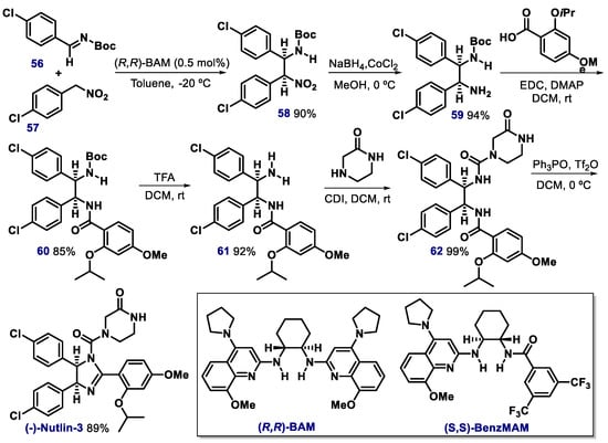 More recently, Johnston and co-workers reported the first enantioselective synthesis of (−)-Nutlin-3 []. The authors developed highly diastereo- and enantioselective aza-Henry additions, i.e., carbon–carbon bond-formation addition of aryl nitromethanes to imines, affording adducts that were used to prepare the cis-stilbene diamine key intermediate precursor (Scheme 15). The aza-Henry adduct 58 was obtained via the reaction of N-Boc-protected imine 56 with aryl nitroalkane 57 and chiral bisamidine catalyst BAM. Next, the reduction of the nitro group afforded amine 59, which was acylated with 2-isopropoxy-4-methoxybenzoic acid giving 60, and later submitted to standard TFA-promoted Boc removal for the obtainment of 61. Then, the monoamide 62 was achieved by a carbamoylation reaction with 2-oxopiperazine; finally, the Nutlin-3a compound was obtained after a Hendrickson’s dehydrative cyclization [,].