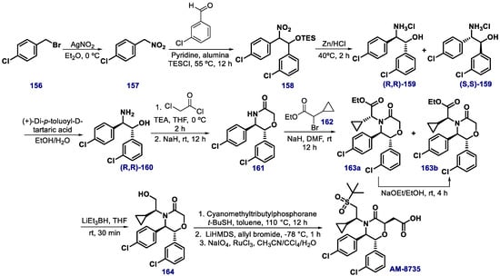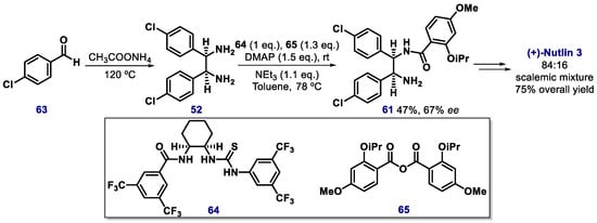 More recently, Fantinatti and co-workers developed the synthesis of Nutlin-3 as a scalemic mixture in which the levorotatory isomer (−)-Nutlin-3 was obtained in 84:16 ratio (Scheme 16) []. Additionally, the synthesis of enantioenriched (+)-Nutlin-3 was discribed using catalyst 64, which was obtained using (1S,2S)-cyclohexanediamine as starting material (Scheme 16). The synthetic pathway in this case was initiated with 4-chlorobenzaldehyde 63, which leads to diamine 52 after the reaction with ammonium acetate; next, amide 61 is synthetized from 52 in the presence of 65 and catalyst 64. After two additional reaction steps, (+)-Nutlin-3 is obtained as a scalemic mixture. It is also worth mentioning that an array of biological tests showed that the activity of scalemic (−)-Nutlin-3 was comparable to that of the commercial eutomer in activating the p53 pathway [].