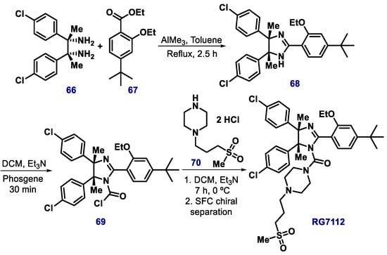 Following a similar path, many new compounds were synthesized based on the structure of Nutlin-3a, with some of them displaying promising results. Vu and co-workers, for instance, reported a new member of the Nutlin family of MDM2 inhibitors, the so-called RG7112 (Scheme 17) [,,]. This compound has advanced to phase I clinical trials in combination with cytarabine in patients with acute myelogenous leukemia, neoplasms and hematologic neoplasms []. Basically, as a strategy to optimize the structure of the original Nutlin compounds, the authors chose to preserve the most important features for binding to MDM2, e.g., the 4-chlorophenyl and isopropoxy groups, while exploring alterations in other sites of the molecule. Three main changes in the Nutlin structure were proposed: (a) methyl groups were placed at the imidazoline ring to prevent its oxidation; (b) a variety of polar groups were inserted into the amide side chain to explore their possible effects on binding and pharmacokinetic properties; and (c) a replacement of the 4-methoxy group for tert-butyl, owing to in vitro metabolism studies, which identified this as the most labile site in the molecule. The preparation of such compounds is exemplified in Scheme 17, which shows the synthesis of RG7112 []. Initially, the imidazoline 68 is obtained by the reaction of diamine 66 and benzoate ester 67 in the presence of trimethylaluminum. Next, the intermediate 69 is obtained by the phosgenation of 68. Then, the reaction of 69 with substituted piperazine 70 in the presence of triethylamine leads to racemic compound RG7112. The enantiomers are later separated by chiral chromatography.