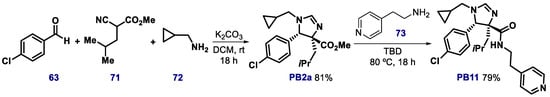 In 2010, Domling’s group introduced a new process for predicting and preparing antagonists of the p53/HDM2 interaction []. This approach consisted on the use of multicomponent reactions (MCR) to synthesize new potential p53-HDM2 inhibitors starting from a fragment. Although no protein–protein interaction analyses were conducted, computational studies have indicated the potential of the new molecules, which imidazole PB11 being the most promising one. The synthesis of the compound PB11 was achieved starting with the Orru three-component reaction between p-chlorobenzaldehyde 63, isocyanoacetate 71, and cyclopropylmethylamine 72 followed by an amidation step (Scheme 18).