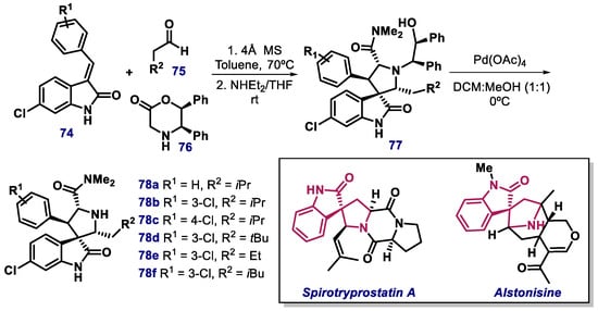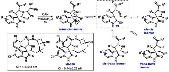 Since the discovery of the imidazolines or Nutlins family, many research groups have invested in the search for new nitrogen heterocycles that include benzodiazepines [], indole-2-carboxylic acid derivatives [] and pyrrolidines [], among others. Wang and co-workers, for example, reported the design of a spiroindoline-3,3’-pyrrolidine series as potent, highly selective and orally active small-molecule inhibitors of the MDM2-p53 interaction [,]. The authors identified that the natural alkaloids spirotryprostatin A and Alstonisine displayed a steric hindrance that would keep them from fitting properly into the MDM2 cleft, but presented features in their structure that could be used as inspiration for designing new MDM2 inhibitors (Scheme 19).