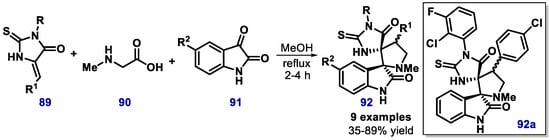 - Ding, K.; Wang, G.; Deschamps, J.R.; Parrish, D.A.; Wang, S. Synthesis of spirooxindoles via asymmetric 1,3-dipolar cycloaddition. Tetrahedron Lett. 2005, 46, 5949–5951. [Google Scholar] [CrossRef]