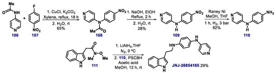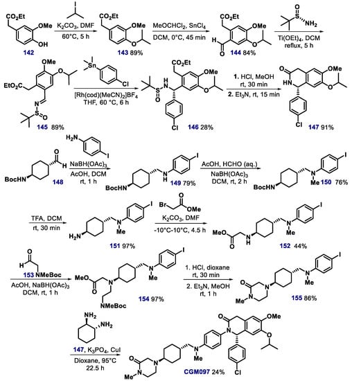 In a similar path, SCH529074 is another quinazoline-type molecule which can reactivate mutant p53 and also bind to p53 DNA binding domain, interrupting HDM2-mediated ubiquitination of WTp53 [,]. SCH529074 synthesis can also be achieved using intermediate 27; the reaction of 27 with benzyl chloride gives 32, which is next chlorinated, furnishing 33 (Scheme 8) []. 33 is then reacted with N,N’-dimethylpropane-1,3-diamine, affording 34, which is next converted to 35 after a reduction step. Finally, the reaction of 35 with 4,4’-(chloromethylene)bis(chlorobenzene) 28 gives rise to the product.