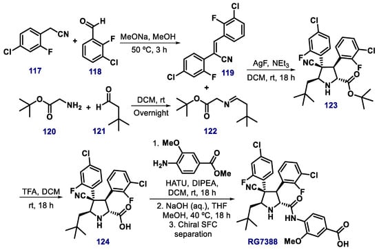 - Rimmler, G.; Alker, A.; Bosco, M.; Diodone, R.; Fishlock, D.; Hildbrand, S.; Kuhn, B.; Moessner, C.; Peters, C.; Rege, P.D.; et al. Practical synthesis of MDM2 antagonist RG7388. Part 2: Development of the Cu(I) catalyzed [3 + 2] asymmetric cycloaddition process for the manufacture of idasanutlin. Org. Process Res. Dev. 2016, 20, 2050–2056. [Google Scholar] [CrossRef]