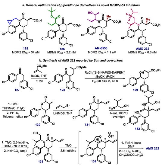 - Liao, G.; Yang, D.; Ma, L.; Li, W.; Hu, L.; Zeng, L.; Wu, P.; Duan, L.; Liu, Z. The development of piperidinones as potent MDM2-P53 protein-protein interaction inhibitors for cancer therapy. Eur. J. Med. Chem. 2018, 159, 1–9. [Google Scholar] [CrossRef] [PubMed]