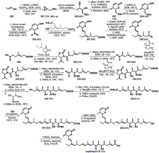 - Kobayashi, M.; Wang, W.; Tsutsui, Y.; Sugimoto, M.; Murakami, N. Absolute stereostructure and total synthesis of leptomycin B. Tetrahedron Lett. 1998, 39, 8291–8294. [Google Scholar] [CrossRef]