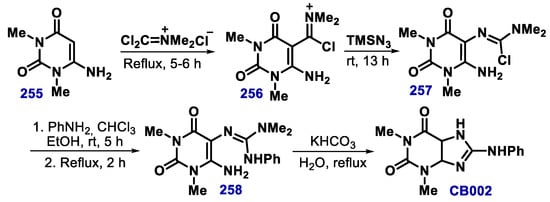 - Kokel, B. A new entry to the imidazo[4,5-d] pyrimidine system. The reaction of 1,3-dimethyl-6-aminouracil with N,N-dimethyldichloromethyleniminium chloride (phosgeniminium chloride) and trimethylsilyl azide, a novel and convenient “one pot” synthesis of 8-N-arylaminotheophyllines (2-N-arylamino-4,6-dimethylimidazo[4,5-d]pyrimidine-(4H,6H)-5,7-diones), starting from 1,3-dimethyl-6-aminouracil. Heterocycl. Chem. 1994, 31, 1185. [Google Scholar]